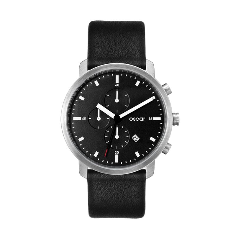 44MM STEEL MATTE SILVER CASE, CHRONOGRAPH MVMT, BLACK DIAL, DTE DISPLAY, LEATHER STRAP, FLAT MINERAL
